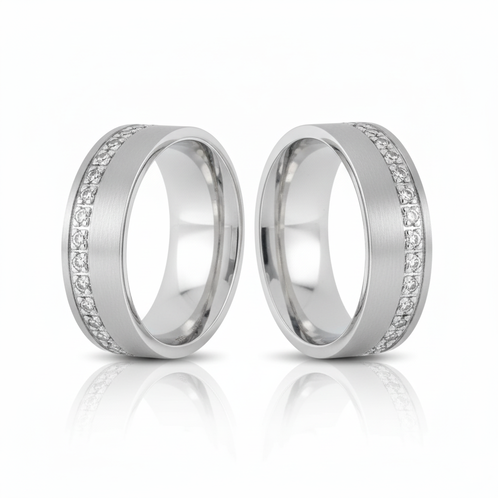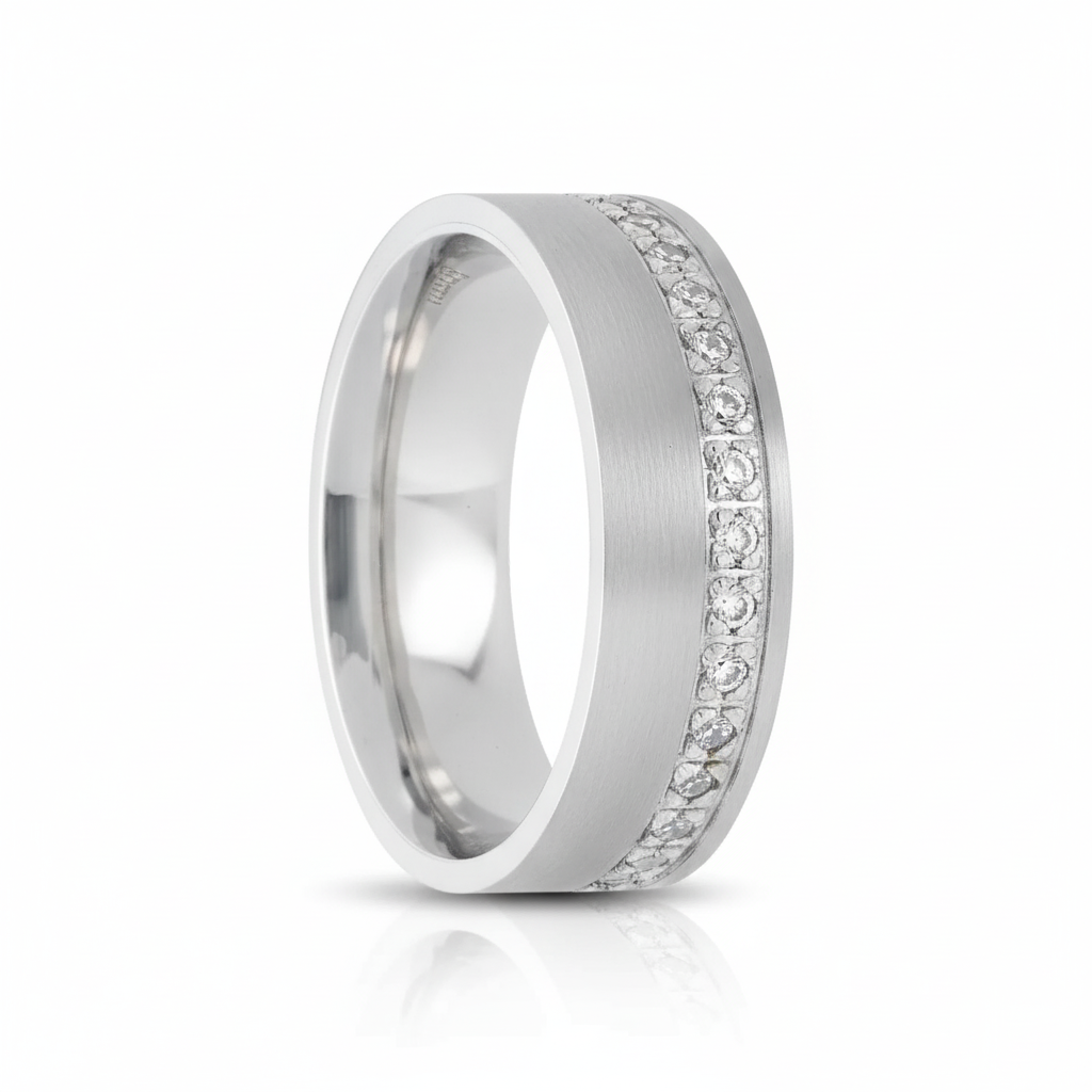 • Anillo de boda liso con borde adornado con zirconias en corte brillante