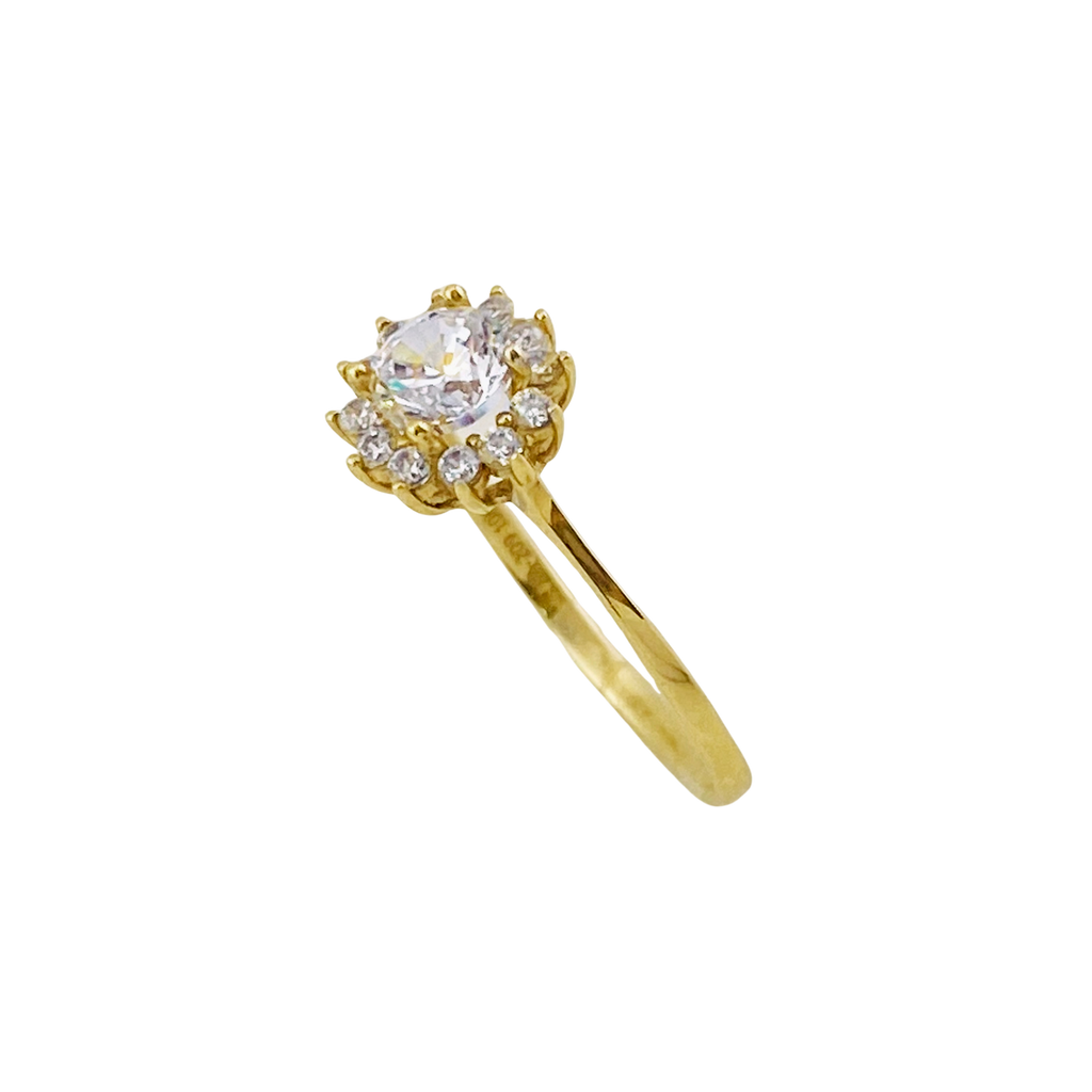 Anillo de compromiso con zirconia central y halo de zirconias en forma de flor