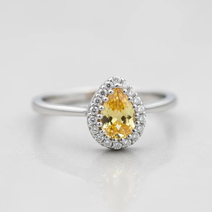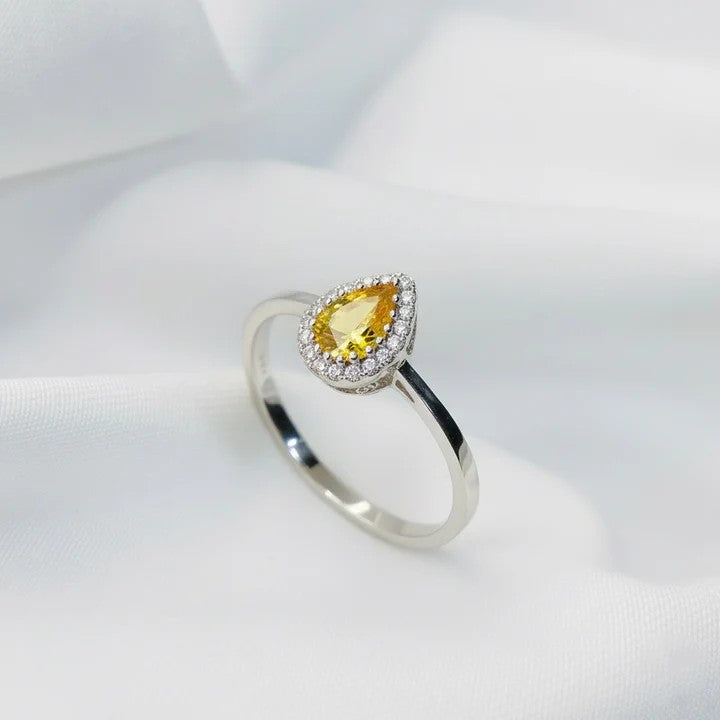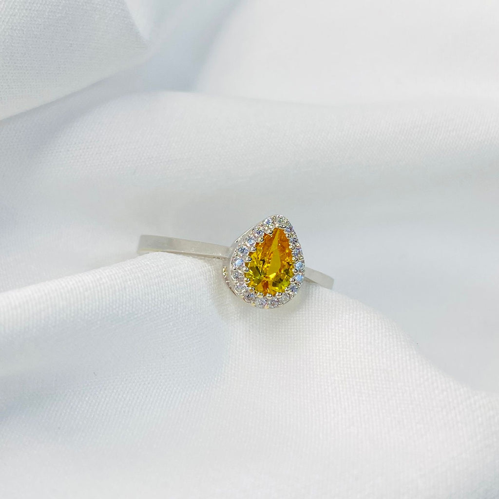 • Anillo para dama Gota Amarilla central y halo de zirconias en corte brillante
