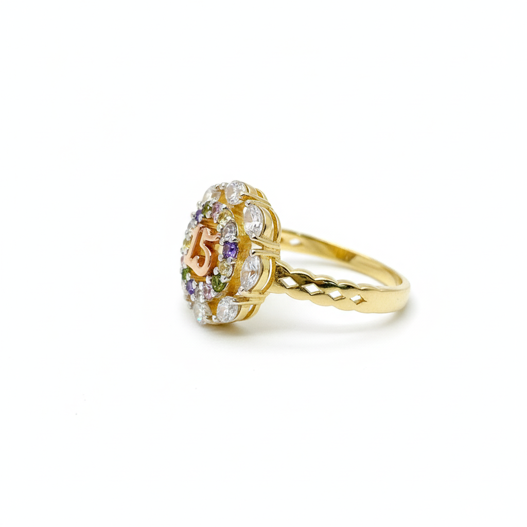 Precioso anillo para quinceañeras que resalta la elegancia del oro con el resplandor radiante de las zirconias