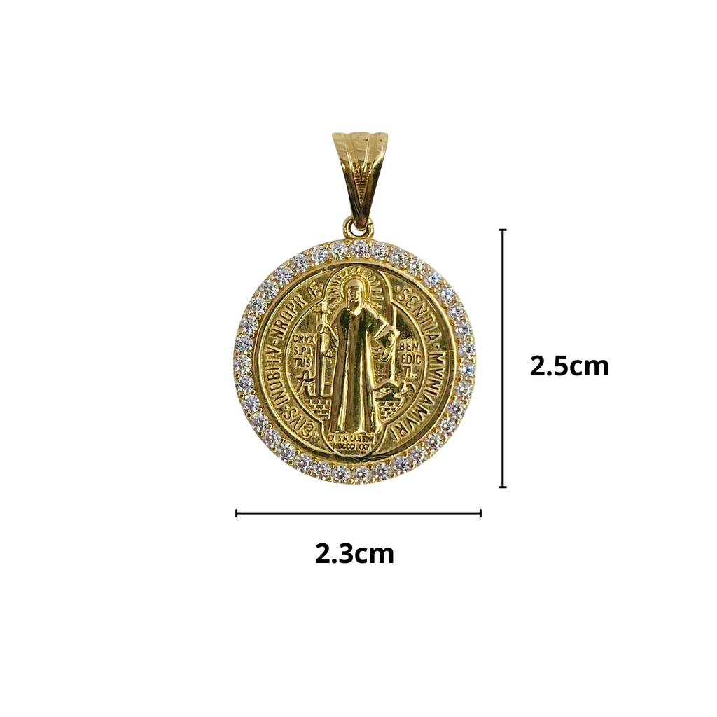 Medalla redonda con imagen en relieve de San Benito rodeada de zirconias