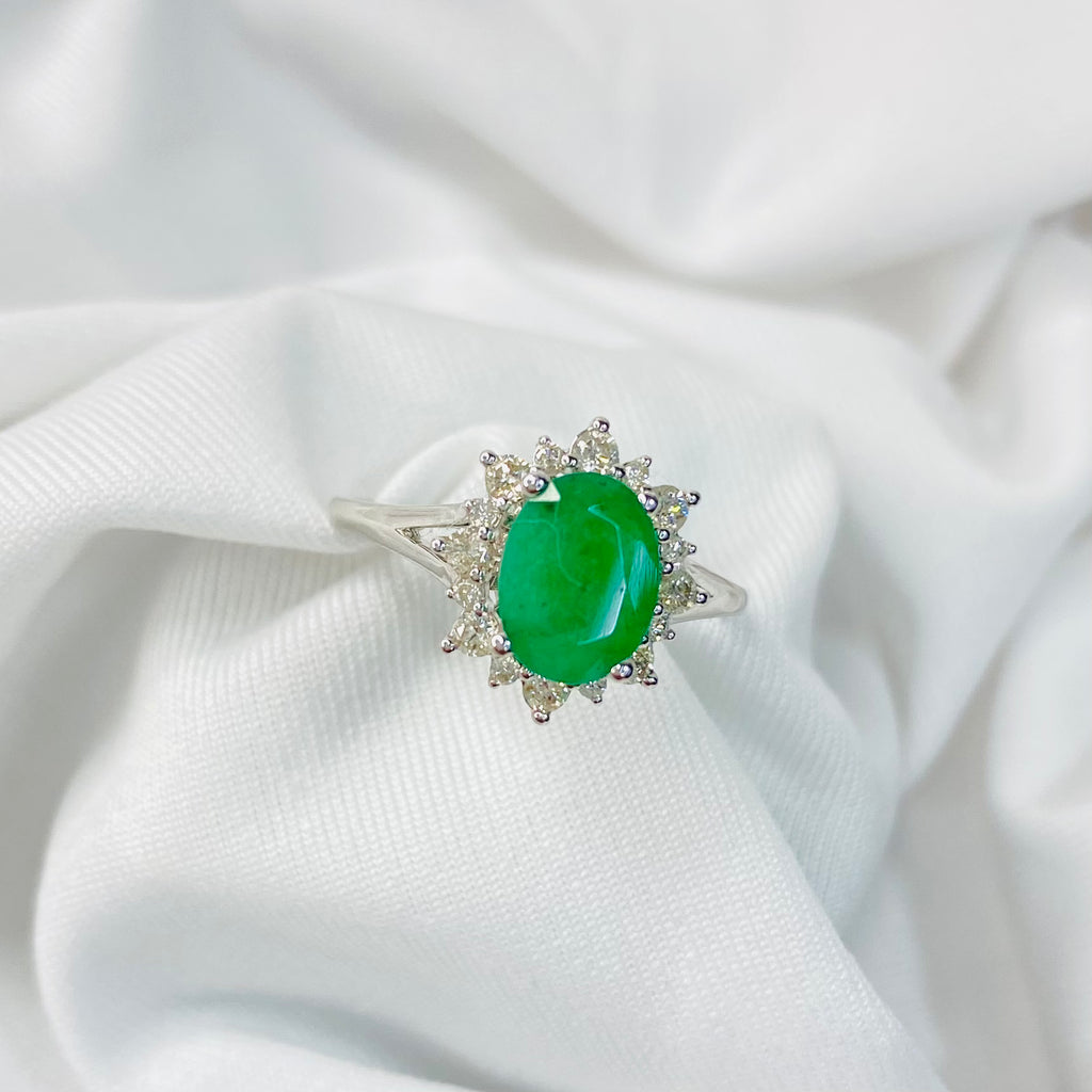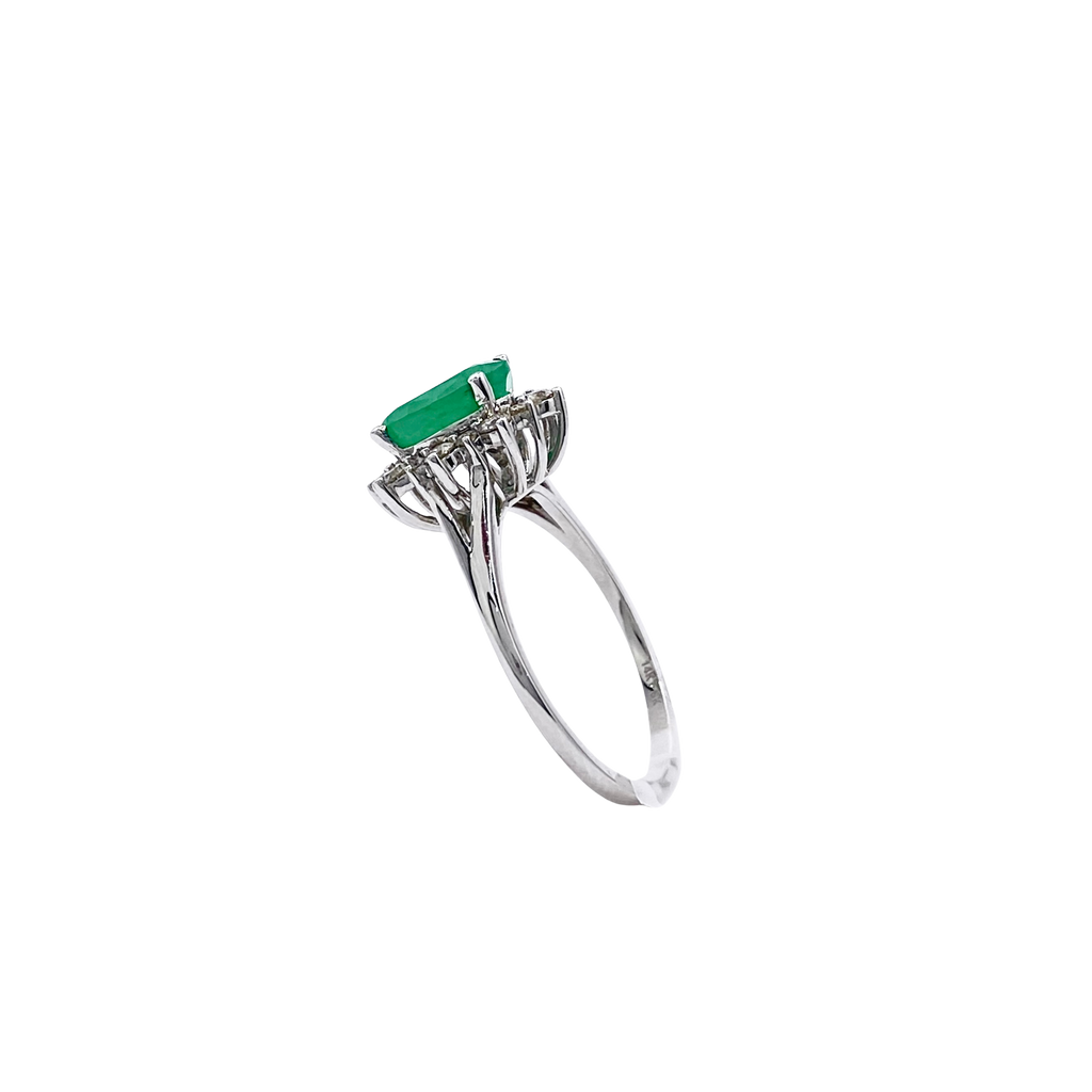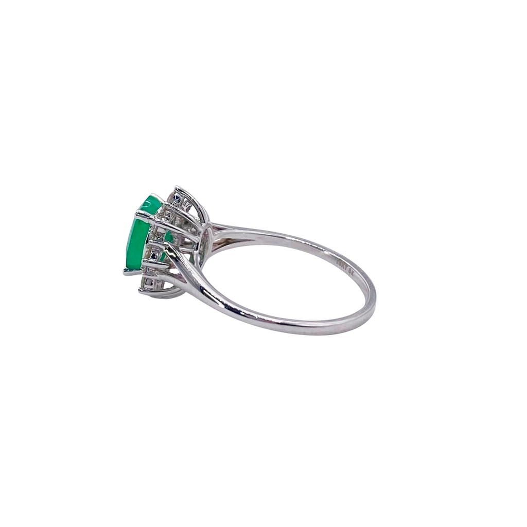 Anillo de compromiso roseta de oro blanco 14k con 25 puntos de diamante y 1.37 carats de esmeralda