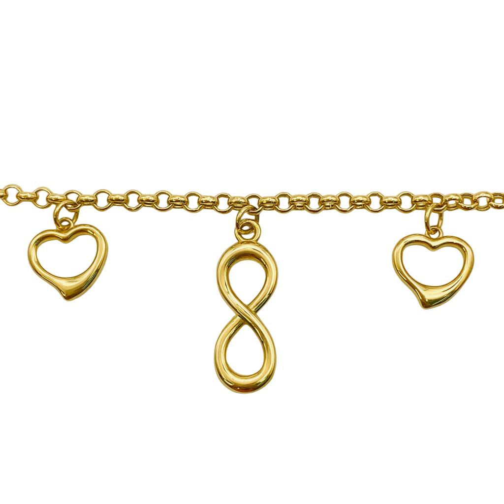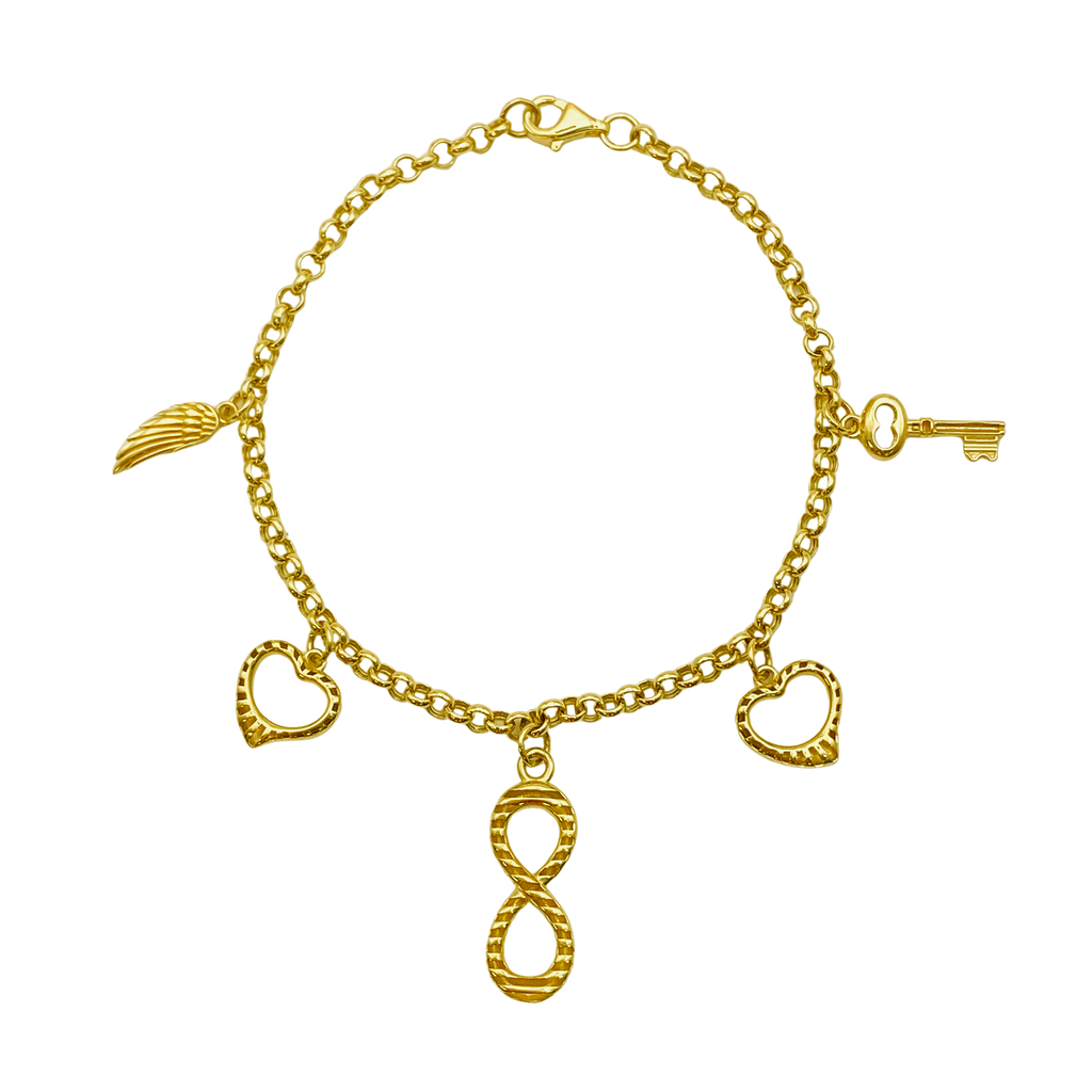Pulso para dama eslabones con dijes de corazones, llave, infinito y ala